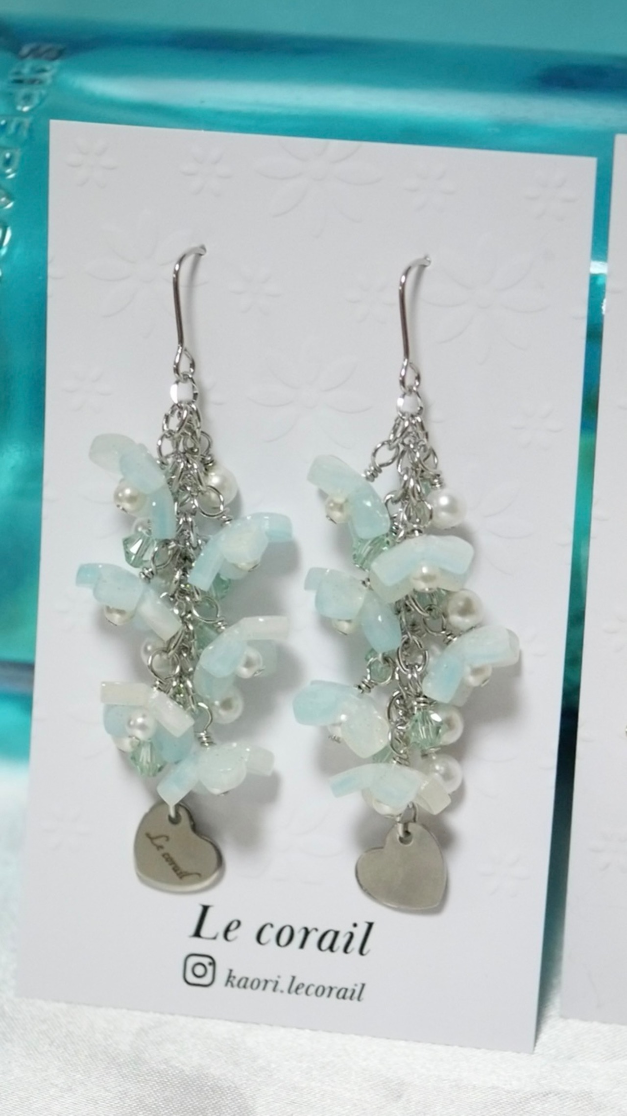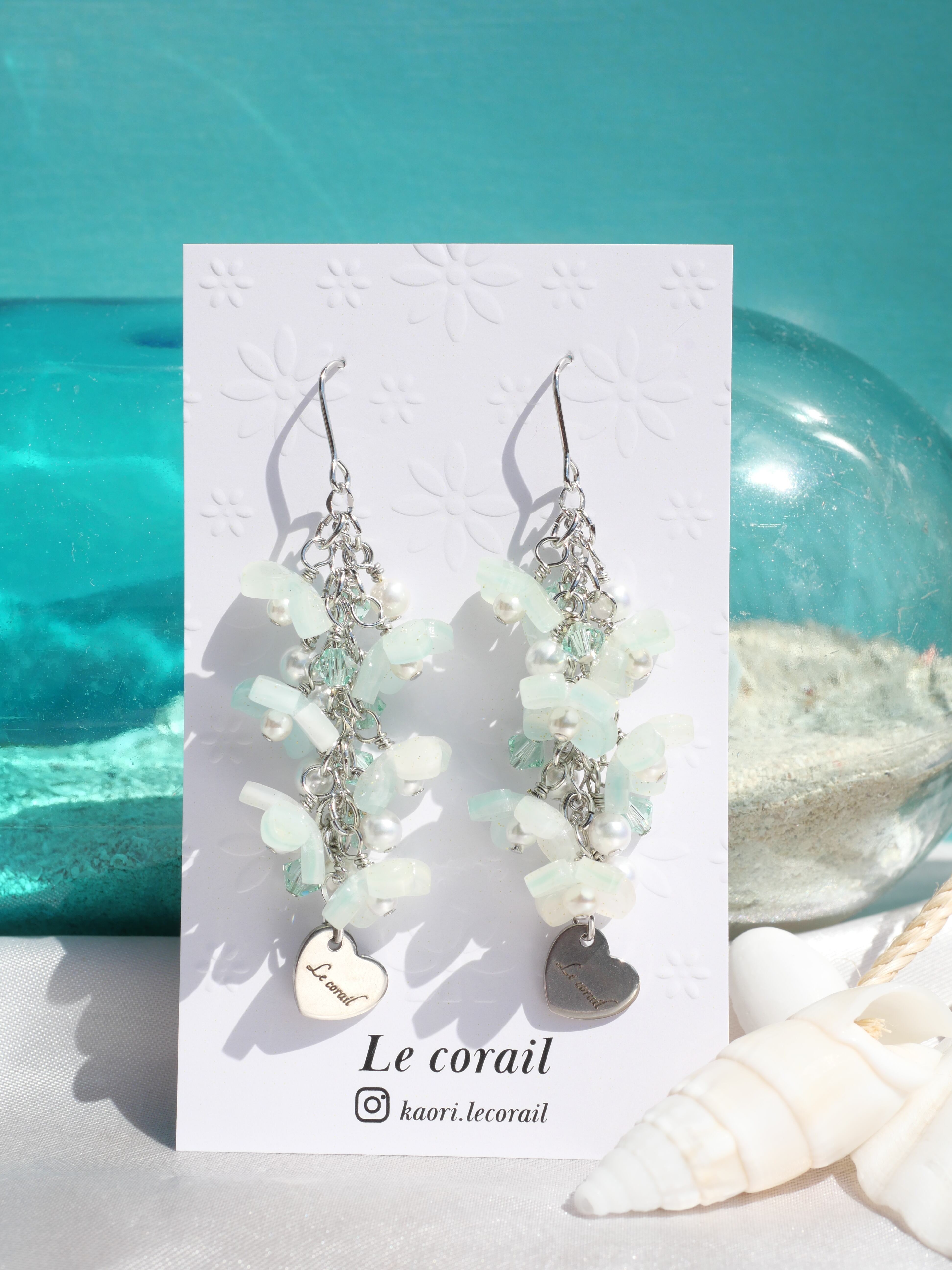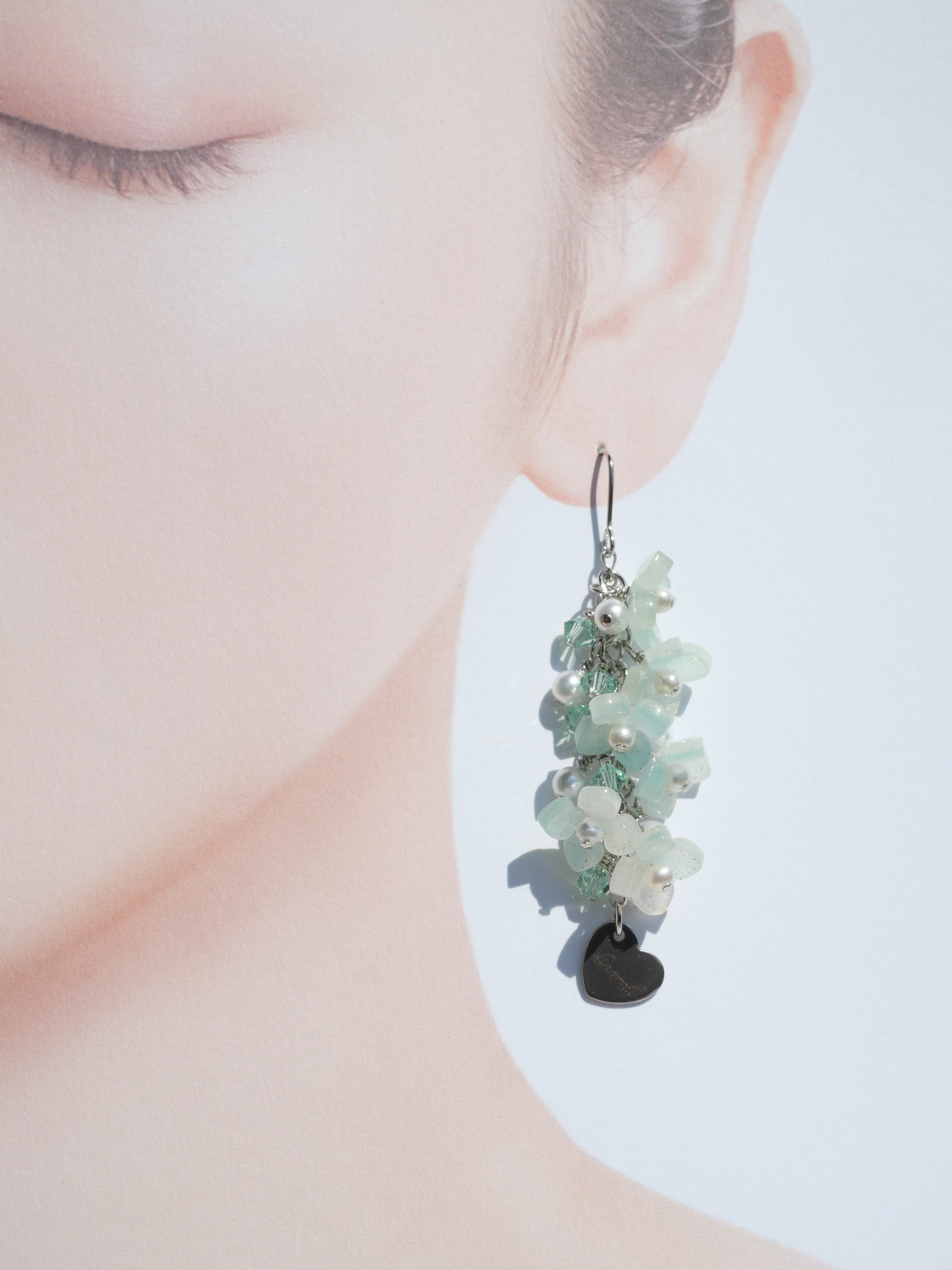 AJISAI greenの名にふさわしい、このピアスは涼しげな青いあじさいの花をモチーフにし、紫外線に反応して色が変化する特別な魅力を持っています。陽射しの下での色の変化が、耳元に瑞々しい彩りを添え、まるで初夏の風を感じるようなデザインです。
