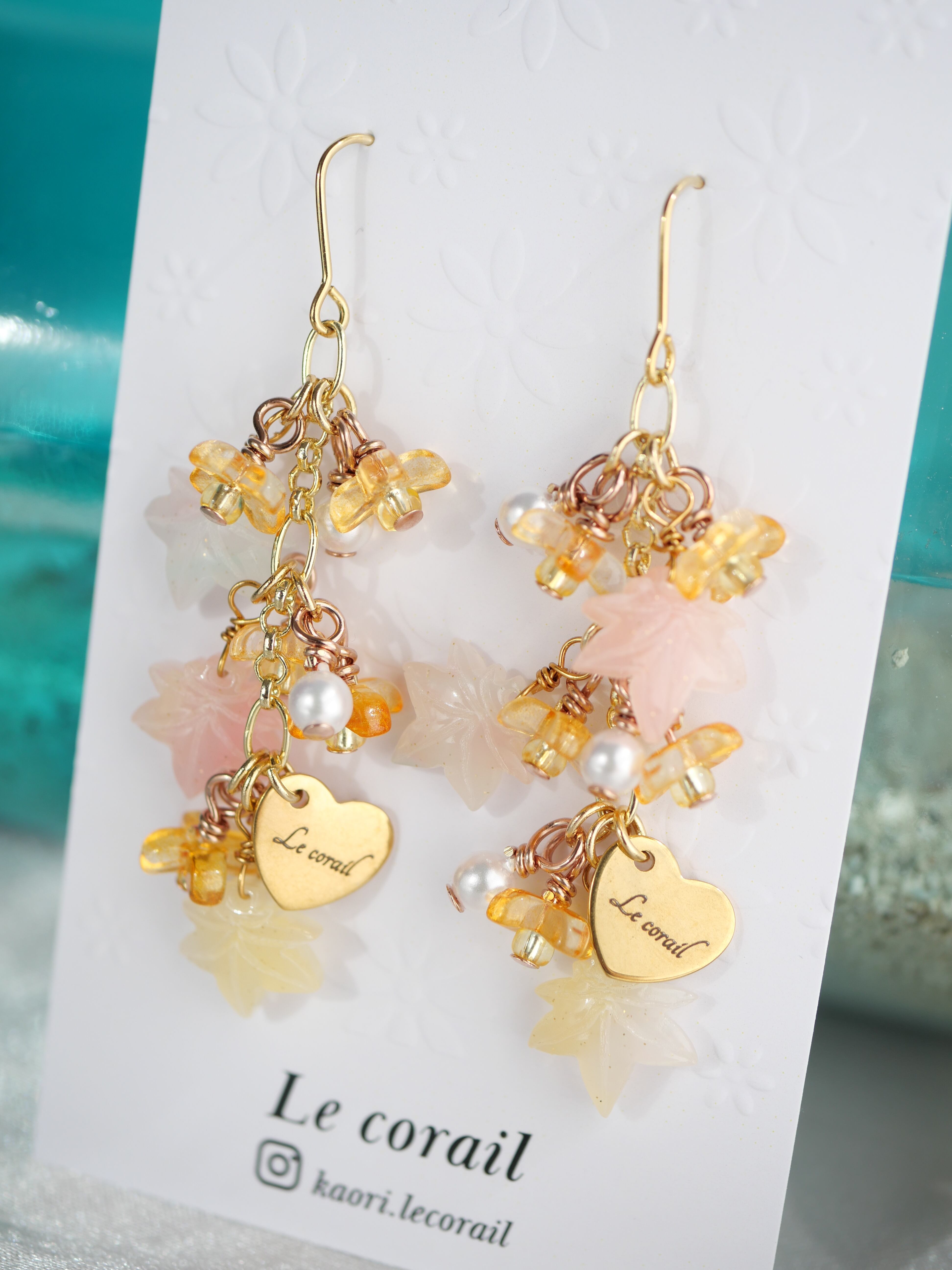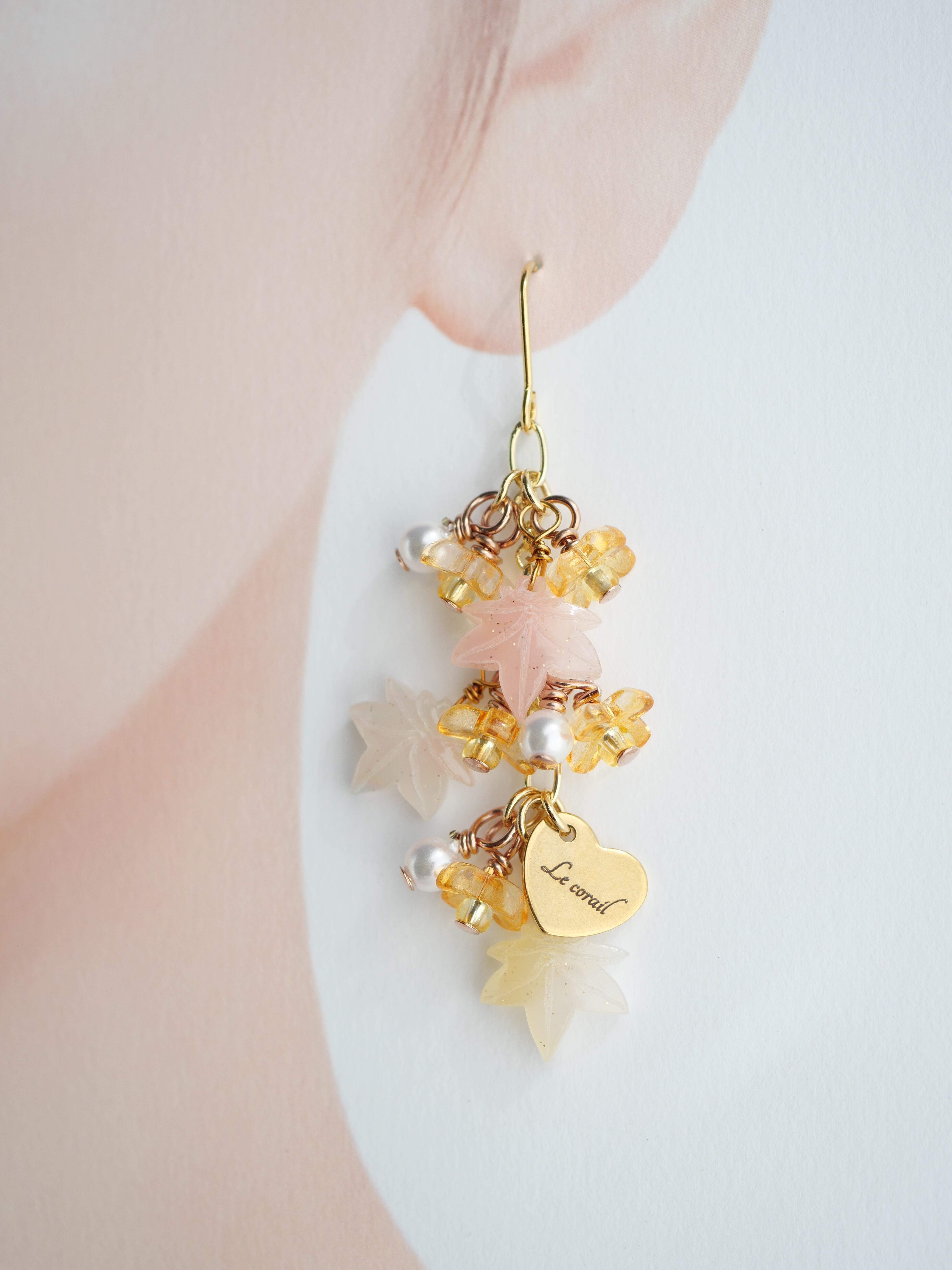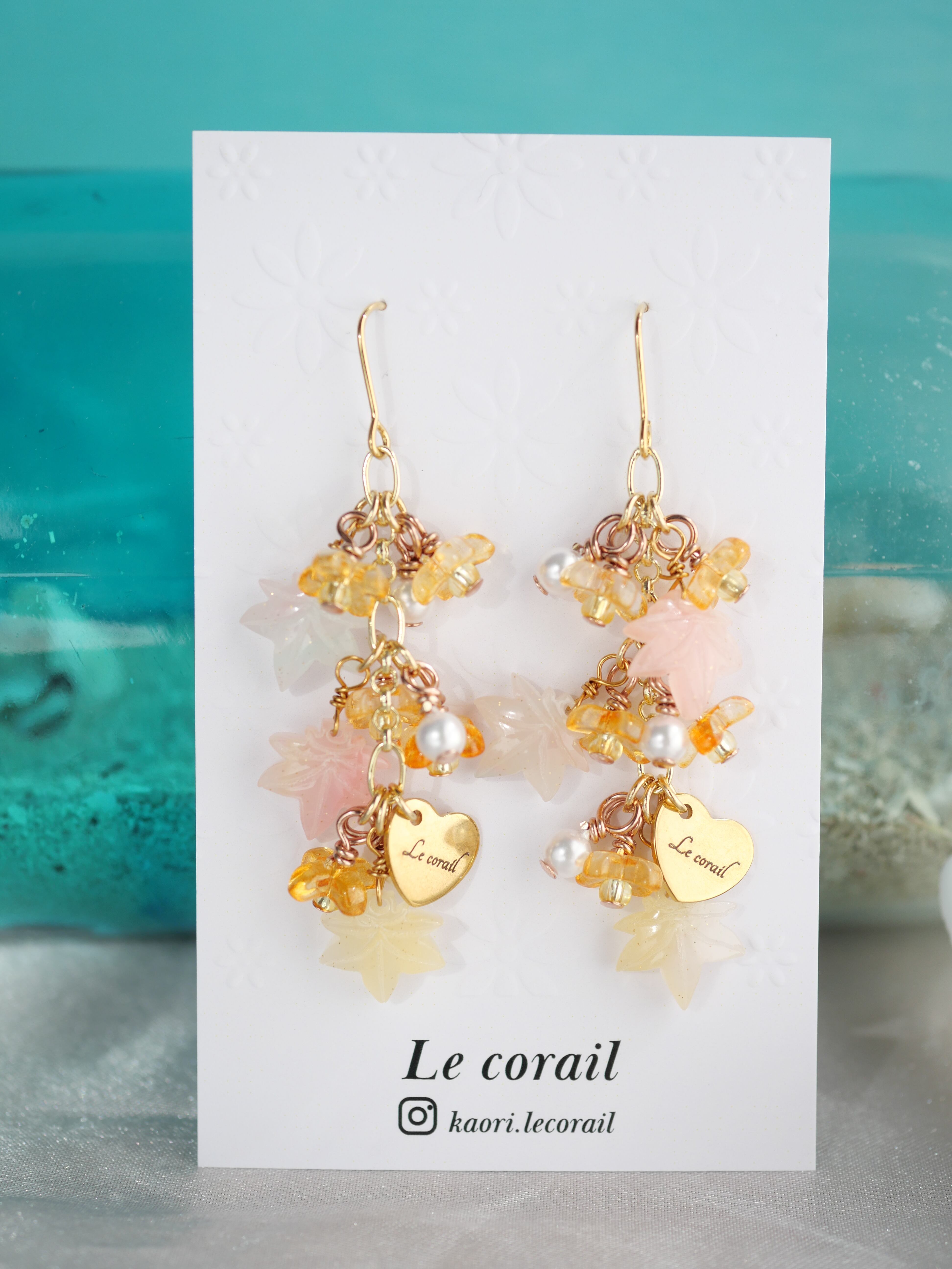 MOMIJIの名にふさわしい、このピアスは紅葉と金木犀をモチーフにしたデザインが魅力。秋の風に揺れる葉っぱの色合いを表現し、まるで秋の深まりを耳元で楽しむようなアイテムです。金木犀の甘い香りを思わせる優雅な色合いが、特別なシーンを演出します。