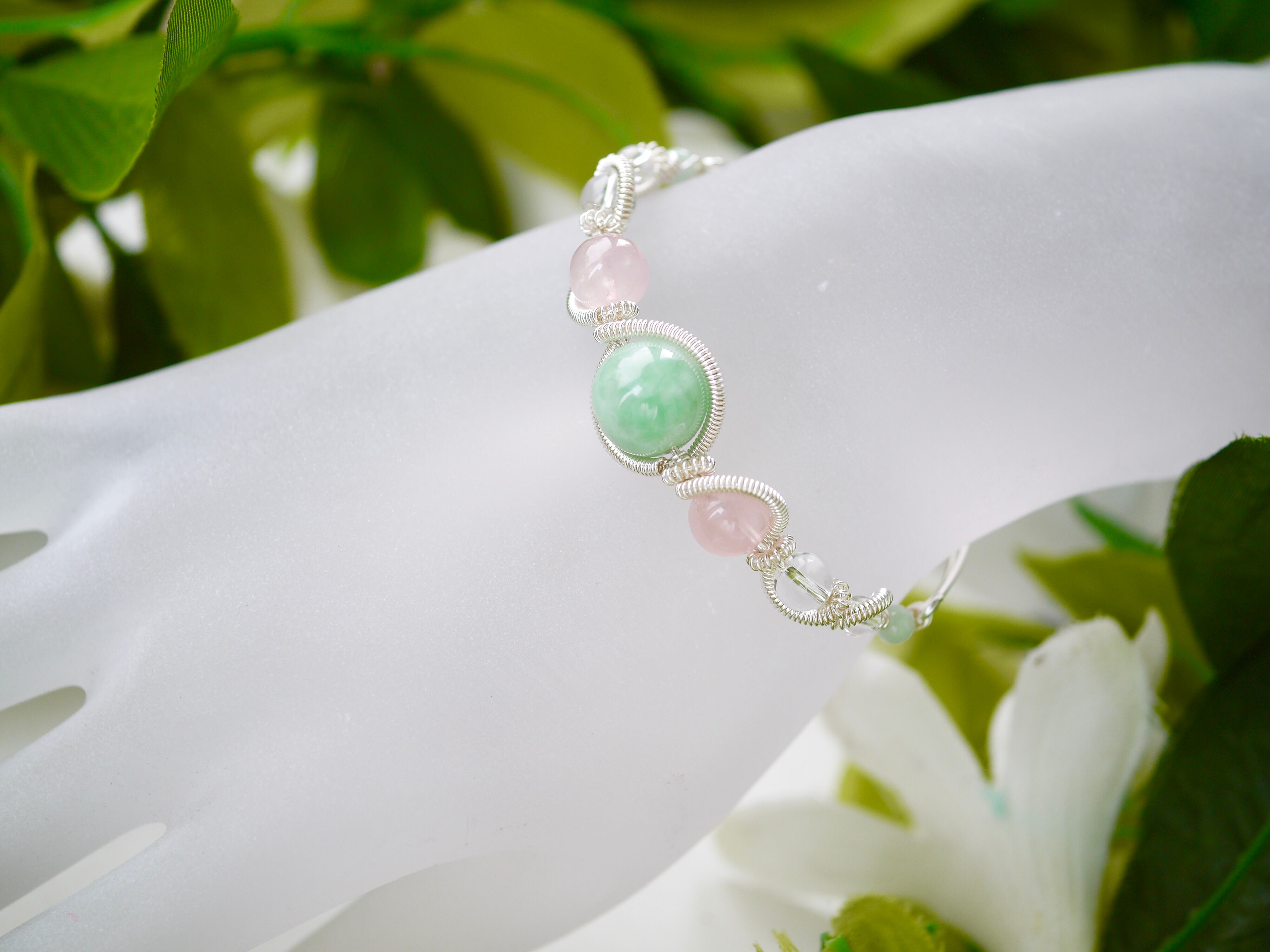 本翡翠をメインにディープローズクォーツを合わせたコイルデザインバングル