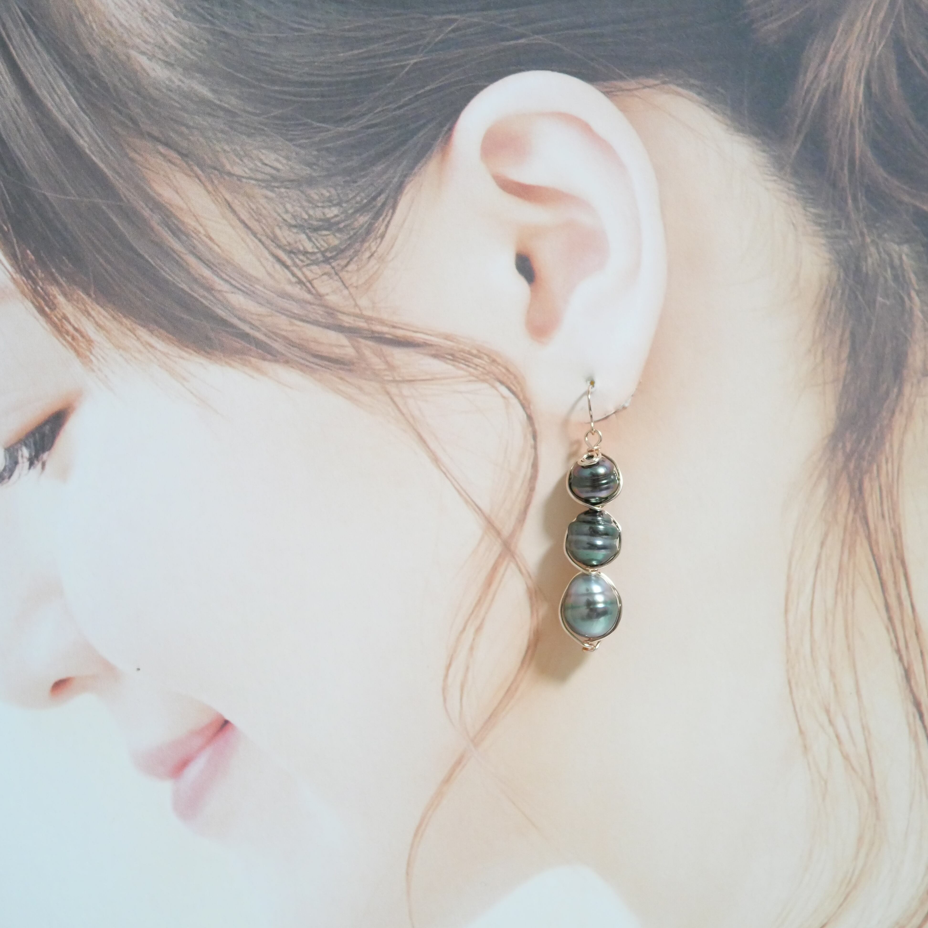 黒蝶真珠タヒチパールを縦ラインに並べたバブルピアス